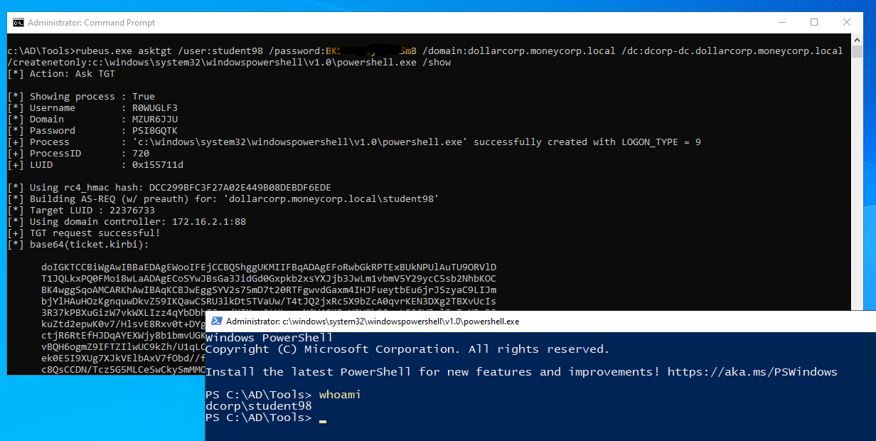 rubeus.exe asktgt /user:student98 /password:'redacted' /domain:dollarcorp.moneycorp.local /dc:dcorp-dc.dollarcorp.moneycorp.local /createnetonly:c:\windows\system32\windowspowershell\v1.0\powershell.exe /show