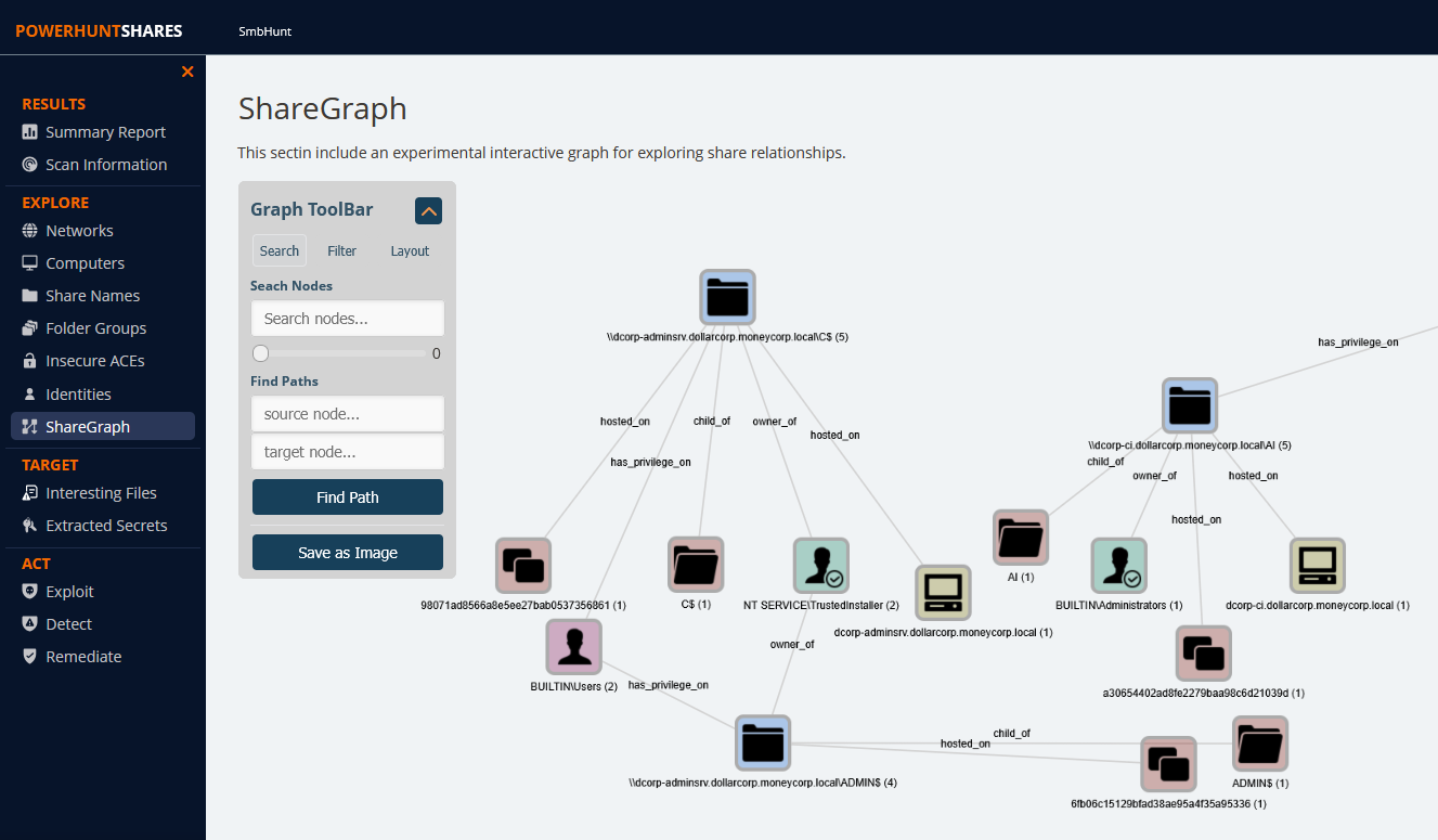 PS C:\Users\student98> Import-Module C:\AD\Tools\PowerHuntShares.psm1 PS C:\Users\student98> Invoke-HuntSMBShares -NoPing -OutputDirectory C:\ad\Tools\ -HostList C:\ad\Tools\servers.txt =============================================================== INVOKE-HUNTSMBSHARES =============================================================== This function automates the following tasks: o Determine current computer's domain o Enumerate domain computers o Enumerate SMB shares o Enumerate SMB share permissions o Identify shares with potentially excessive privieleges etc... Note: This can take hours to run in large environments. ||||||||||||||||||||||||||||||||||||||||||||||||||||||||||||||| --------------------------------------------------------------- SHARE DISCOVERY --------------------------------------------------------------- [*][10/02/2025 03:43] Scan Start [*][10/02/2025 03:43] Output Directory: C:\ad\Tools\\SmbShareHunt-10022025034303 [*][10/02/2025 03:43] Importing computer targets from C:\ad\Tools\servers.txt [*][10/02/2025 03:43] 8 systems will be targeted [*][10/02/2025 03:43] - Skipping ping scan. [*][10/02/2025 03:43] Checking if TCP Port 445 is open on 8 computers [*][10/02/2025 03:43] - 8 computers have TCP port 445 open. [*][10/02/2025 03:43] Getting a list of SMB shares from 8 computers [*][10/02/2025 03:43] - 29 SMB shares were found. [*][10/02/2025 03:43] Getting share permissions from 29 SMB shares [*][10/02/2025 03:43] - 52 share permissions were enumerated. [*][10/02/2025 03:43] Identifying potentially excessive share permissions [*][10/02/2025 03:43] - 23 potentially excessive privileges were found on 6 shares across 4 systems. [*][10/02/2025 03:43] Getting directory listings from 6 SMB shares [*][10/02/2025 03:43] - Targeting up to 3 nested directory levels [*][10/02/2025 03:43] - 32 files and folders were enumerated. [*][10/02/2025 03:43] Scan Complete --------------------------------------------------------------- SHARE ANALYSIS --------------------------------------------------------------- [*][10/02/2025 03:43] Analysis Start [*][10/02/2025 03:43] - 6 shares can be read across 4 systems. [*][10/02/2025 03:43] - 5 shares can be written to across 4 systems. [*][10/02/2025 03:43] - 6 shares are considered non-default across 4 systems. [*][10/02/2025 03:43] - 2 shares are considered high risk across 1 systems. [*][10/02/2025 03:43] - Identified top 200 owners of excessive shares. [*][10/02/2025 03:43] - Identified top 200 share groups. [*][10/02/2025 03:43] - Identified top 200 share names. [*][10/02/2025 03:43] - Identified shares created in last 90 days. [*][10/02/2025 03:43] - Identified shares accessed in last 90 days. [*][10/02/2025 03:43] - Identified shares modified in last 90 days. [*][10/02/2025 03:43] - Identified 3 subnets hosting shares configured with excessive privileges. [*][10/02/2025 03:43] Finding interesting files... [*][10/02/2025 03:43] Grabbing secrets for parsing... Select : Property "OperatingSystem" cannot be found. At C:\AD\Tools\PowerHuntShares.psm1:2812 char:89 + ... arget445Comp | Select OperatingSystem -ExpandProperty OperatingSystem + ~~~~~~~~~~~~~~~~~~~~~~~~~~~~~~~~~~~~~~~~~~~~~~~~~~~~~~ + CategoryInfo : InvalidArgument: (@{ComputerName=...oneycorp.local}:PSObject) [Select-Object], PSArgumen tException + FullyQualifiedErrorId : ExpandPropertyNotFound,Microsoft.PowerShell.Commands.SelectObjectCommand [*][10/02/2025 03:43] Creating ShareGraph nodes and edges... [*][10/02/2025 03:43] Analysis Complete --------------------------------------------------------------- SHARE REPORT SUMMARY --------------------------------------------------------------- [*][10/02/2025 03:43] Domain: SmbHunt [*][10/02/2025 03:43] Start time: 10/02/2025 03:43:03 [*][10/02/2025 03:43] End time: 10/02/2025 03:43:56 [*][10/02/2025 03:43] Run time: 00:00:53.3860288 [*][10/02/2025 03:43] [*][10/02/2025 03:43] COMPUTER SUMMARY [*][10/02/2025 03:43] - 8 domain computers found. [*][10/02/2025 03:43] - 0 (0.00%) domain computers responded to ping. (No Ping) [*][10/02/2025 03:43] - 8 (100.00%) domain computers had TCP port 445 accessible. [*][10/02/2025 03:43] - 4 (50.00%) domain computers had shares that were non-default. [*][10/02/2025 03:43] - 4 (50.00%) domain computers had shares with potentially excessive privileges. [*][10/02/2025 03:43] - 4 (50.00%) domain computers had shares that allowed READ access. [*][10/02/2025 03:43] - 4 (50.00%) domain computers had shares that allowed WRITE access. [*][10/02/2025 03:43] - 1 (12.50%) domain computers had shares that are HIGH RISK. [*][10/02/2025 03:43] [*][10/02/2025 03:43] SHARE SUMMARY [*][10/02/2025 03:43] - 29 shares were found. We expect a minimum of 16 shares [*][10/02/2025 03:43] because 8 systems had open ports and there are typically two default shares. [*][10/02/2025 03:43] - 6 (20.69%) shares across 4 systems were non-default. [*][10/02/2025 03:43] - 6 (20.69%) shares across 4 systems are configured with 23 potentially excessive ACLs. [*][10/02/2025 03:43] - 6 (20.69%) shares across 4 systems allowed READ access. [*][10/02/2025 03:43] - 5 (17.24%) shares across 4 systems allowed WRITE access. [*][10/02/2025 03:43] - 2 (6.90%) shares across 1 systems are considered HIGH RISK. [*][10/02/2025 03:43] [*][10/02/2025 03:43] SHARE ACL SUMMARY [*][10/02/2025 03:43] - 52 ACLs were found. [*][10/02/2025 03:43] - 52 (100.00%) ACLs were associated with non-default shares. [*][10/02/2025 03:43] - 23 (44.23%) ACLs were found to be potentially excessive. [*][10/02/2025 03:43] - 13 (25.00%) ACLs were found that allowed READ access. [*][10/02/2025 03:43] - 5 (9.62%) ACLs were found that allowed WRITE access. [*][10/02/2025 03:43] - 5 (9.62%) ACLs were found that are associated with HIGH RISK share names. [*][10/02/2025 03:43] [*][10/02/2025 03:43] - The most common share names are: [*][10/02/2025 03:43] - 6 of 6 (100.00%) discovered shares are associated with the top 200 share names. [*][10/02/2025 03:43] - 1 stdadmin-gp [*][10/02/2025 