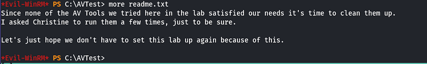 In C:/ drive, there was a folder AVTest which had readme.txt talking about Christine to run AV tools